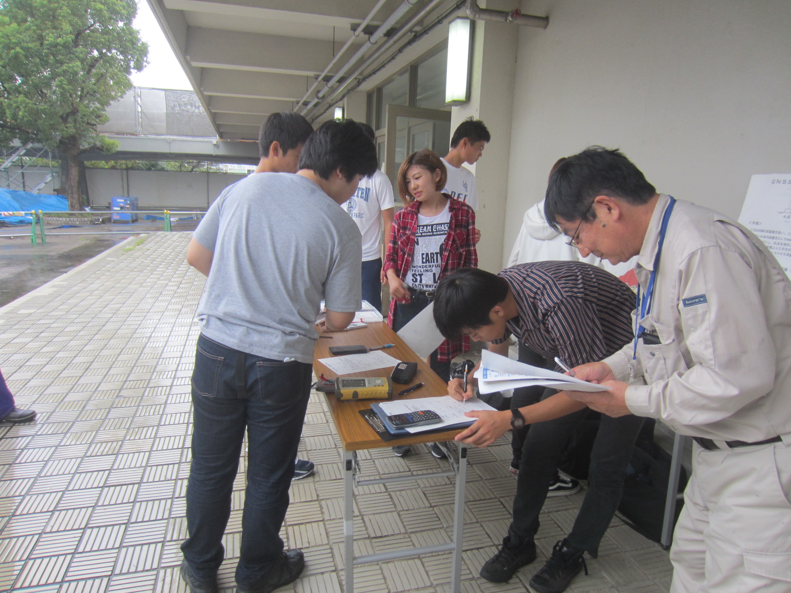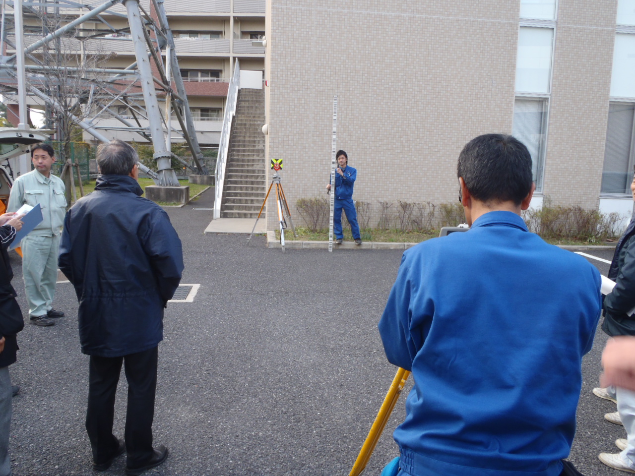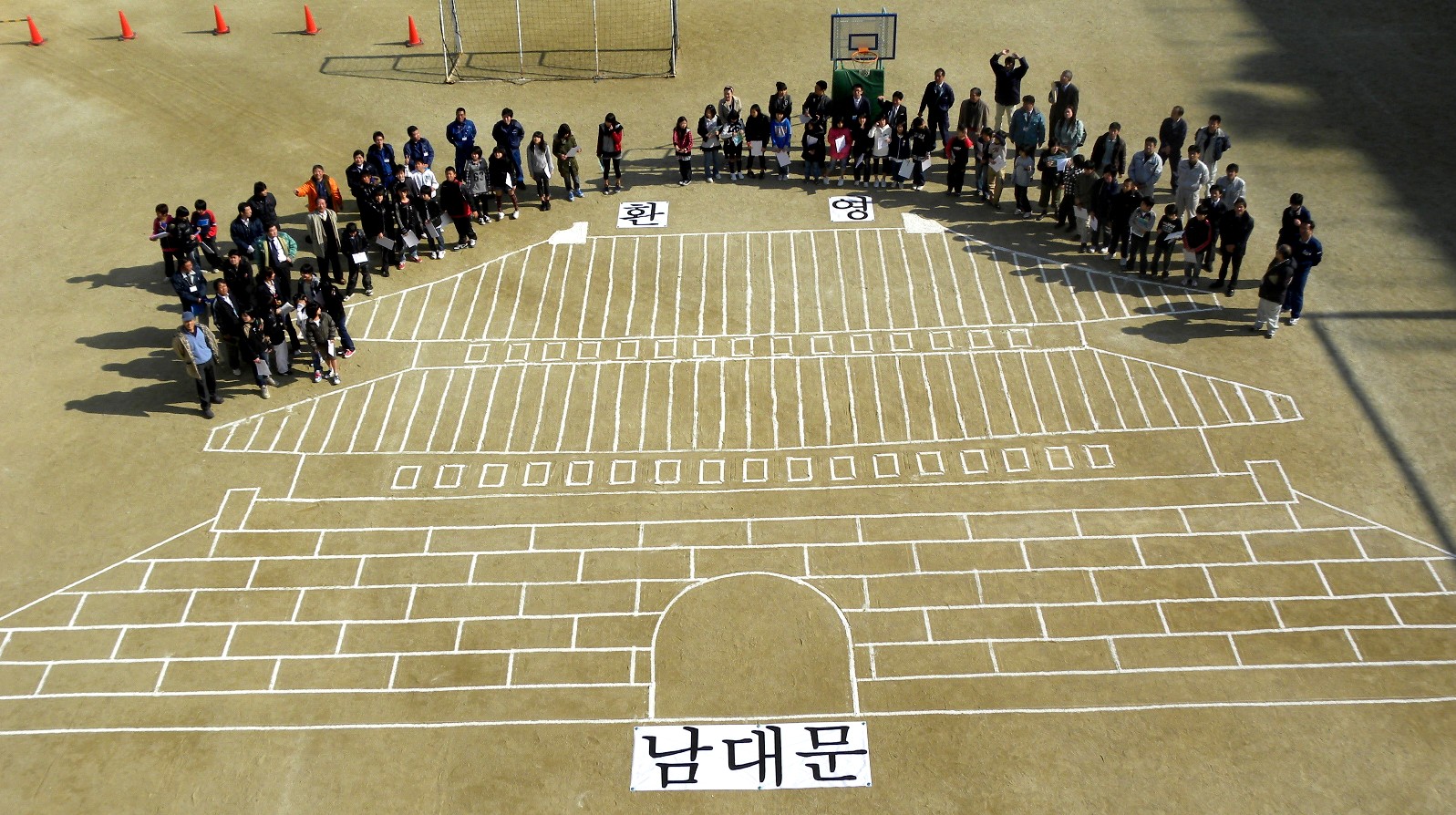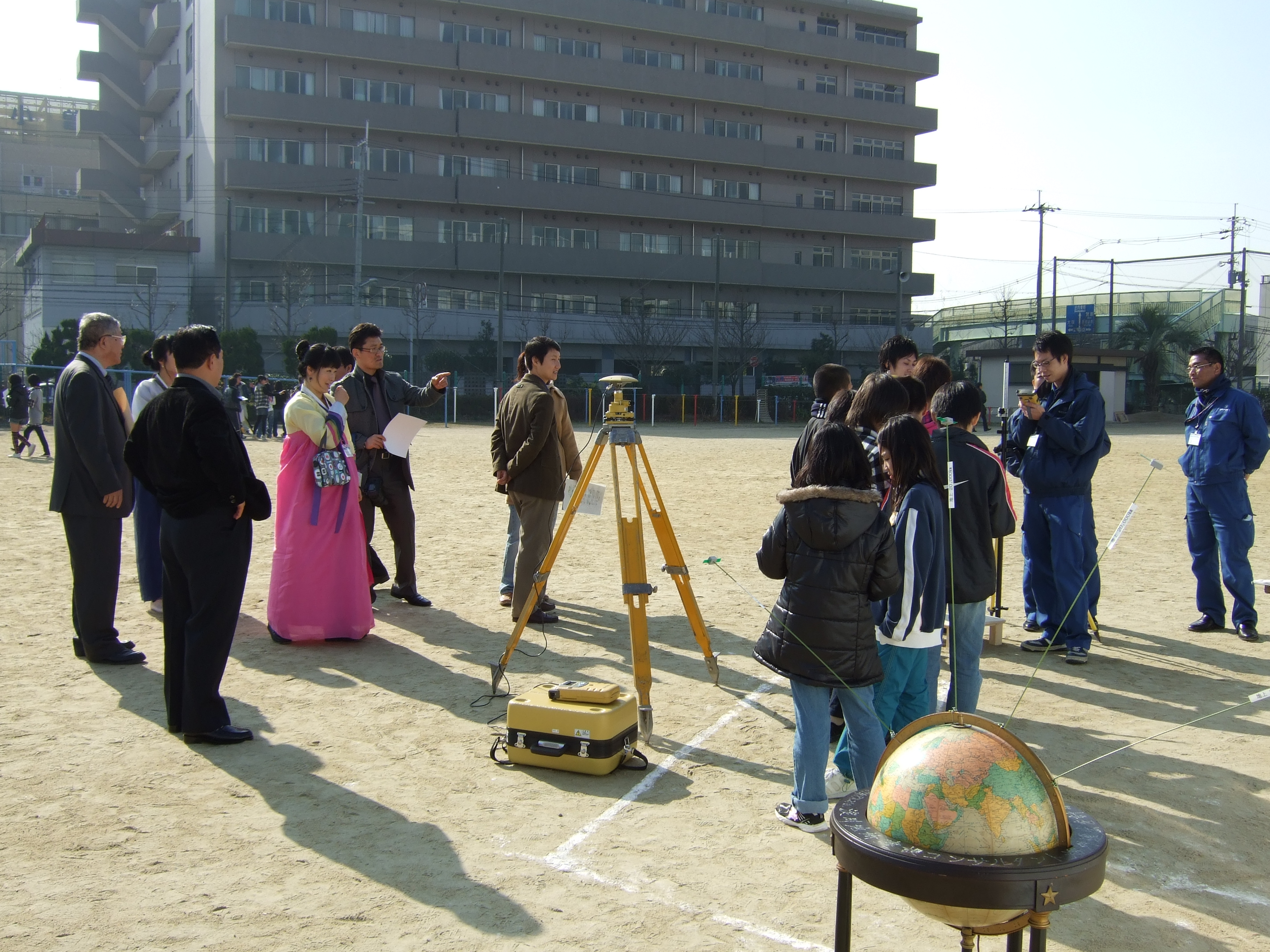 校庭に測量機器を使って南大門を描く。
