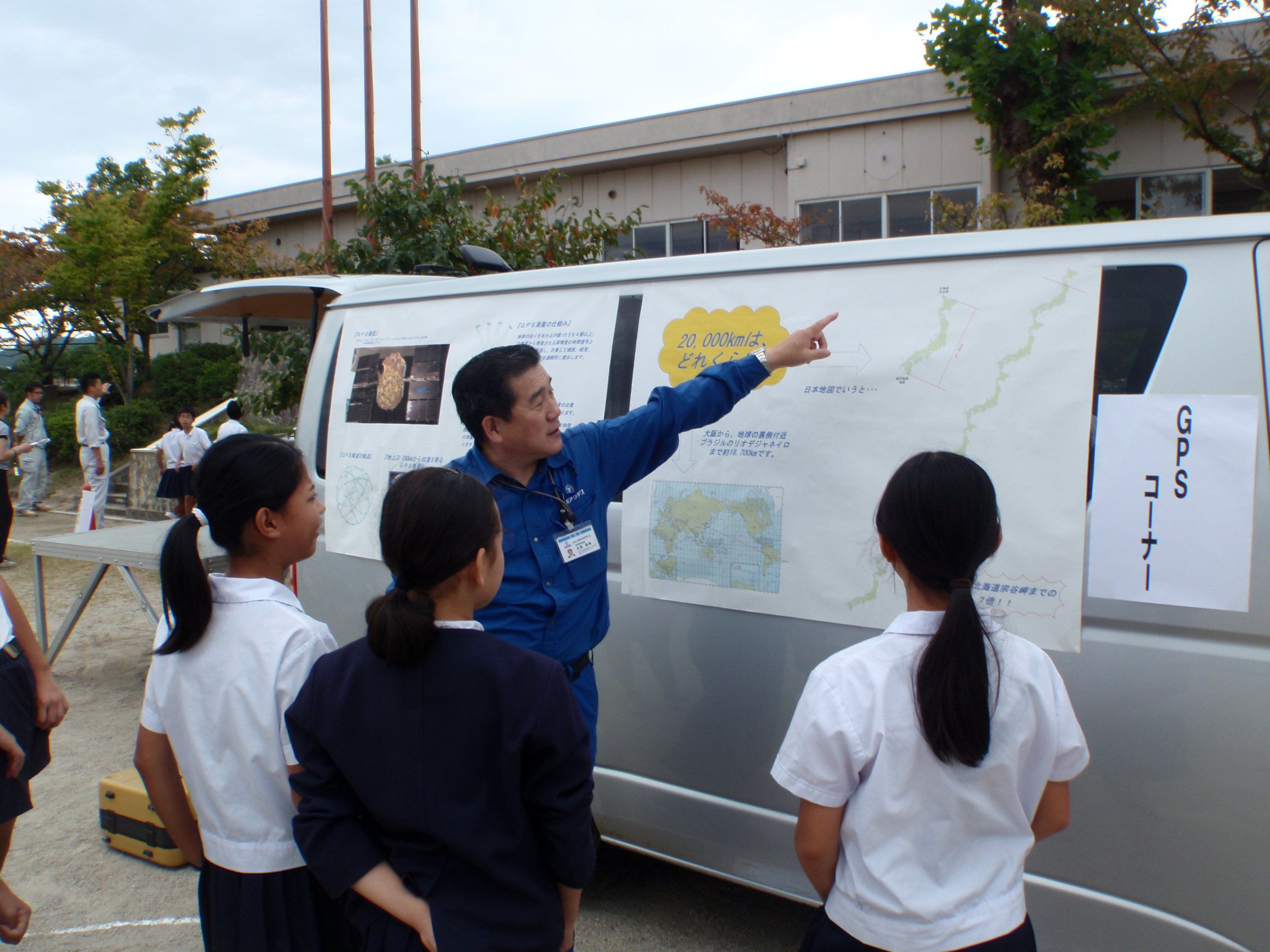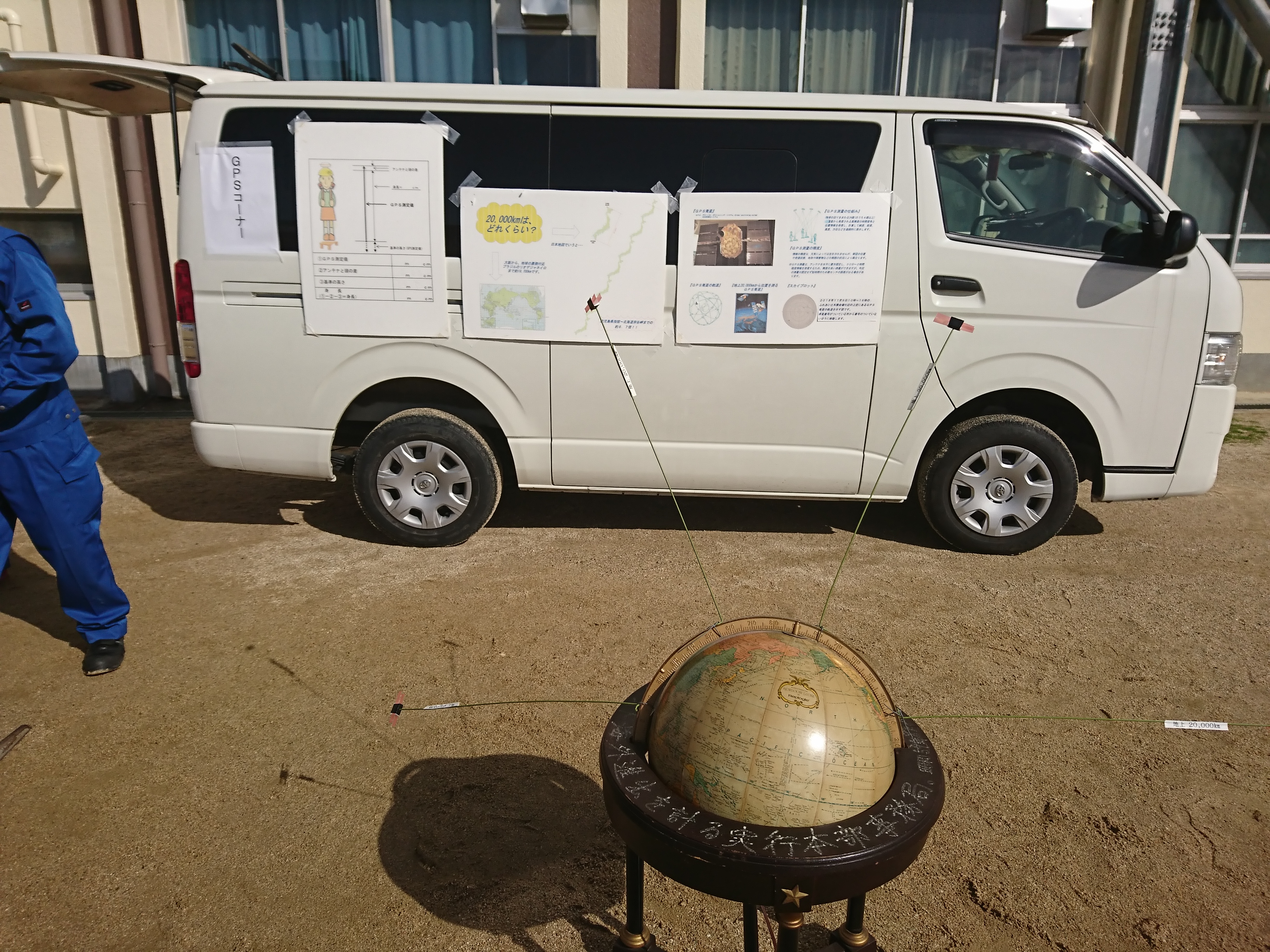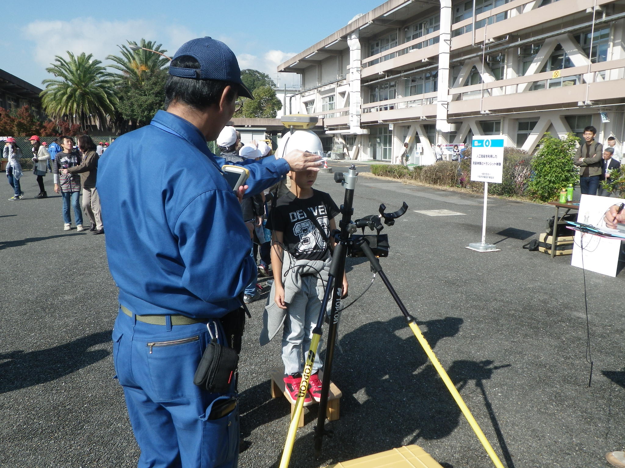 GNSS機器を説明し、地上2万kmの人工衛星を使って身長を測る 。