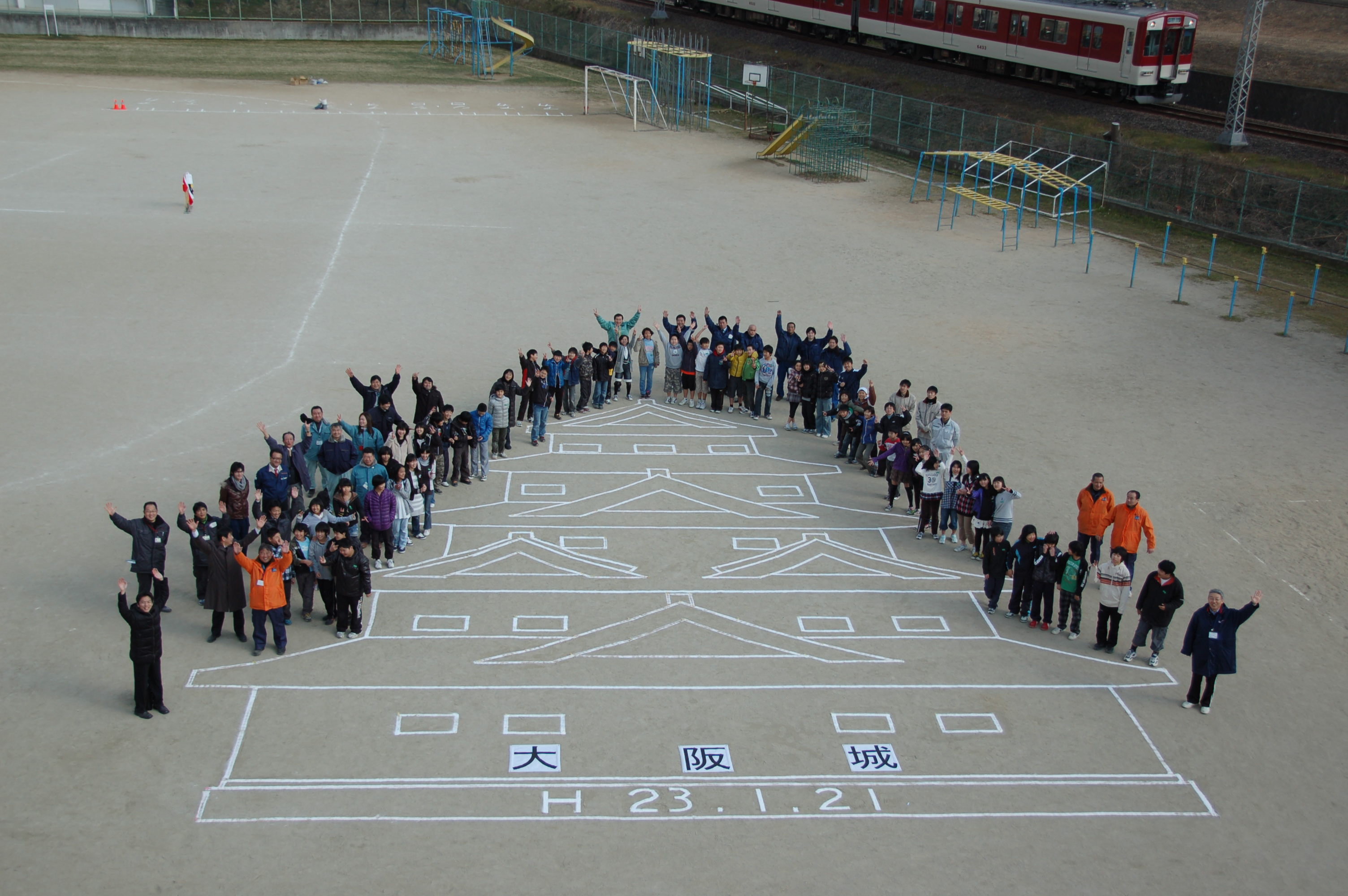 校庭に測量機器を使って大阪城を描く。
