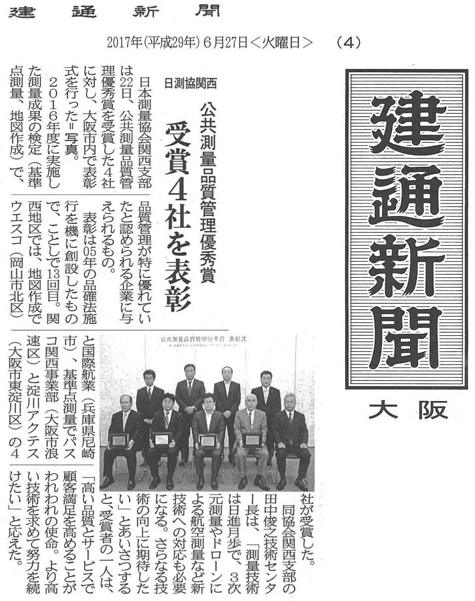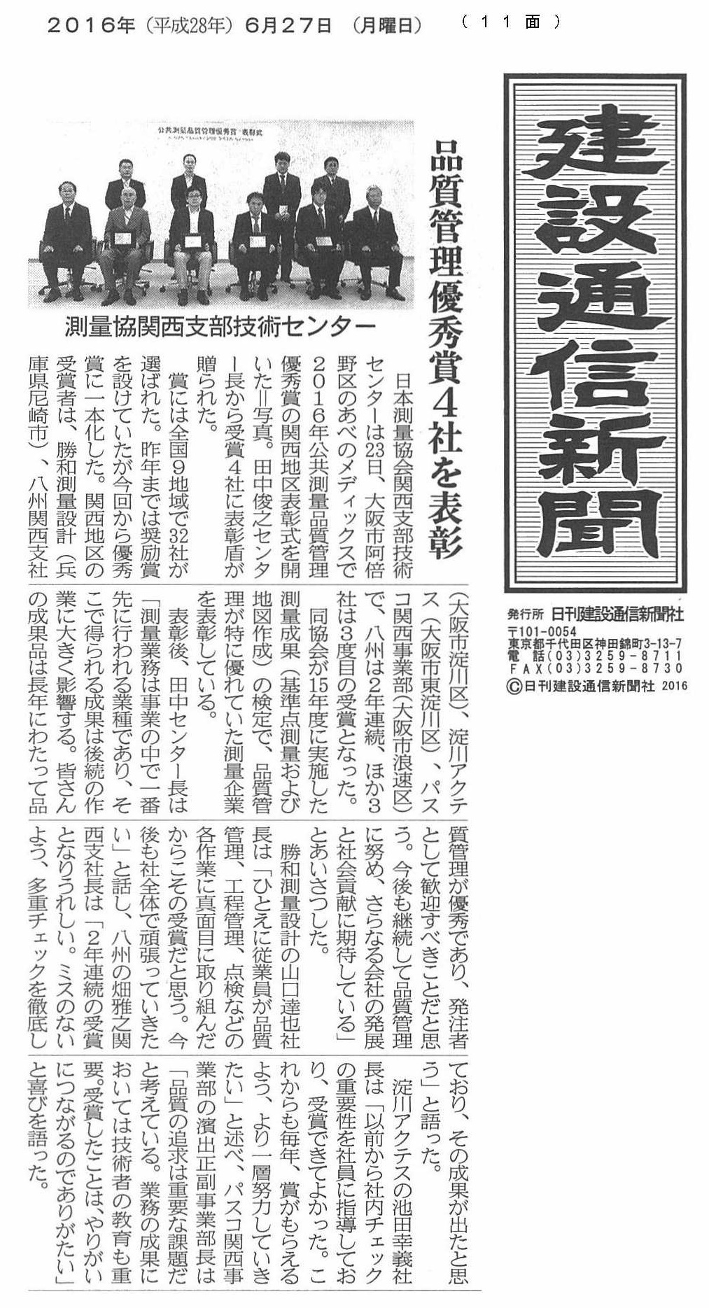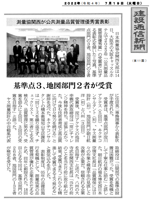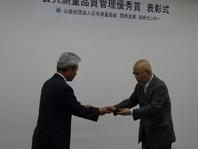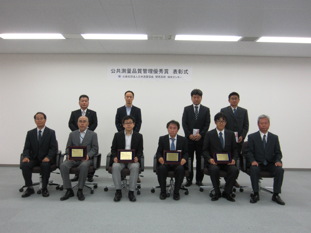 その結果、当社の成果品(基準点)の品質が優れていると認められ、全国で20社(基準点 18社、地図 2社)、当社はその中の関西地区では2社の「第7回 品質管理優秀賞」(基準点)の受賞となりました。