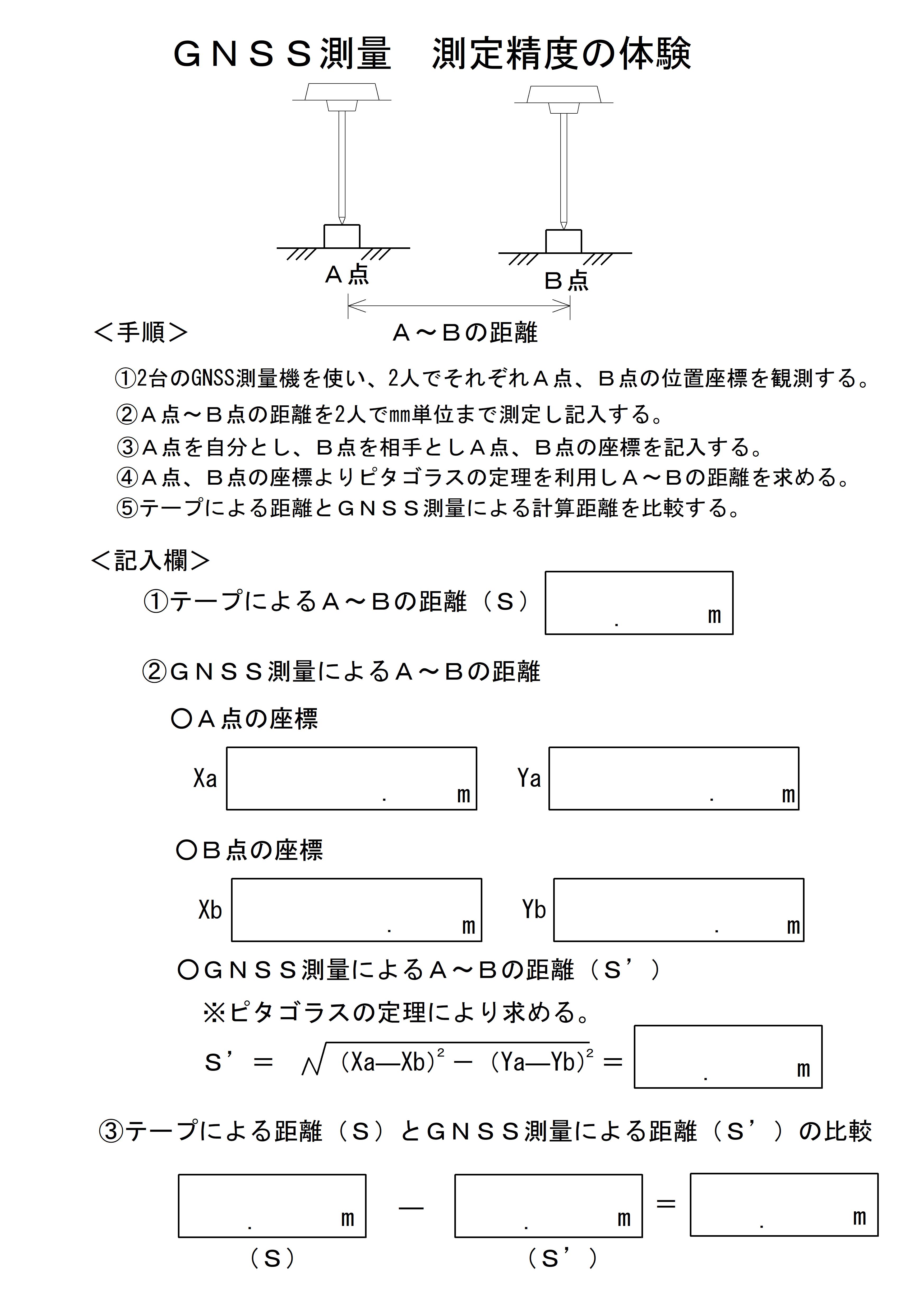 目標Aと目標Bとの高低差を目測し、レベルで測った高さとの誤差を確認する 。