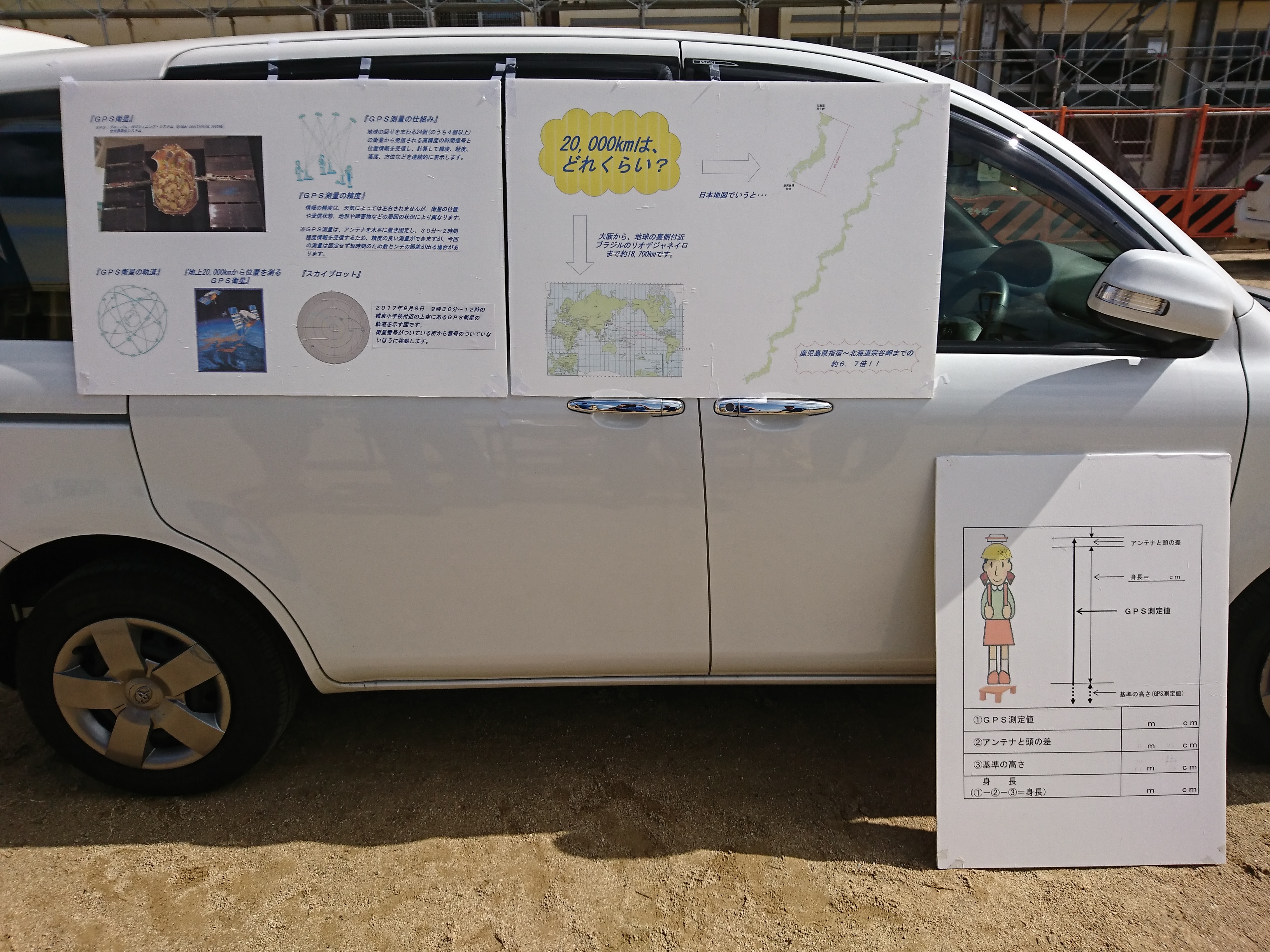 GNSS機器を説明し、地上2万kmの人工衛星を使って身長を測る。
