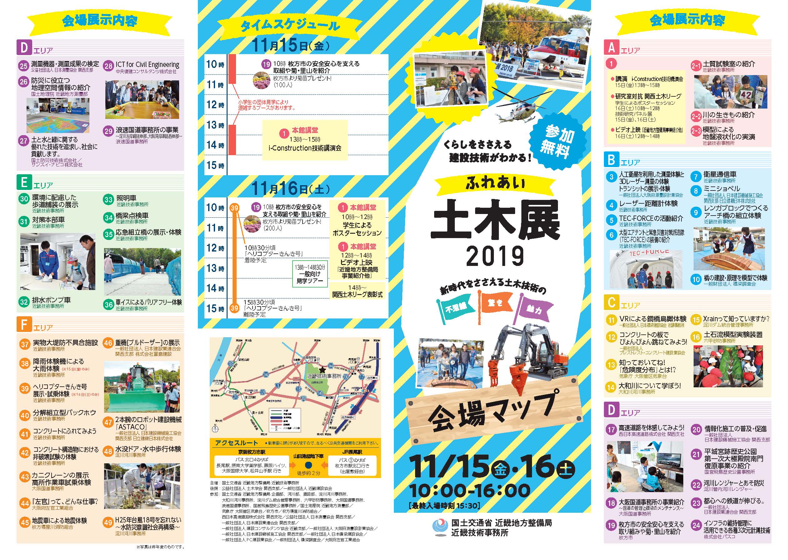 この展示会は、国土交通省近畿地方整備局近畿技術事務所の主催で毎年行っており「観て、触れて、体験できる!」をテーマに、一般の方に土木にまつわる技術を紹介しています。
